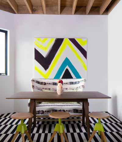 Fat and sassy, orange is not a color for the timid. The choice of these translucent chairs brings warmth without being too shouty, and helps bring out the colors in the paint.