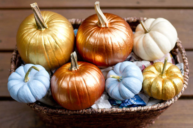 Increase warm autumn glow of a humble pumpkin with a chic coat of sparkling gold or bronze spray paint. Spray them in the open and let dry before grouping them into a wicker basket for a seasonal display with impact.