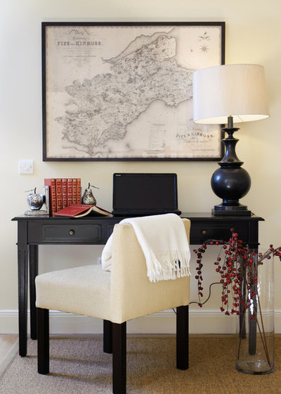 Displays comprises three elements are very pleasing to the eye. We tend to look first at the core, but enjoy the sense of it being flanked by two similar parts. Here, three black vases hold three small branches peppered with bright berries. The arrangement provides autumn red accents and a little sculptural style to the table.
