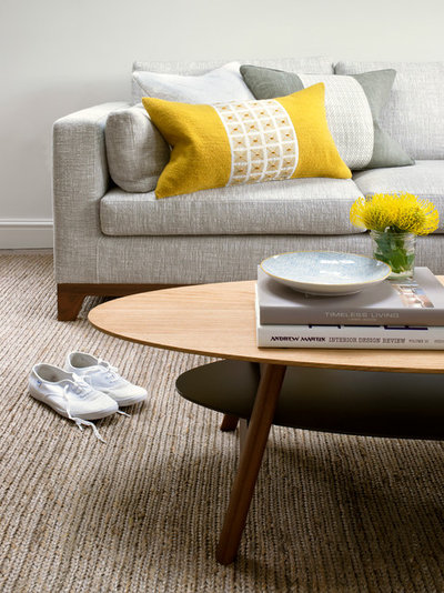 This mat is a quick and easy way to add pattern and color on the trend, with bold lines that echo Crittal style windows and more natural textures scattered across the piece. Ikat weaving cushions add to yellow on gray pattern, creating a look that is bold, but still feels relaxed.