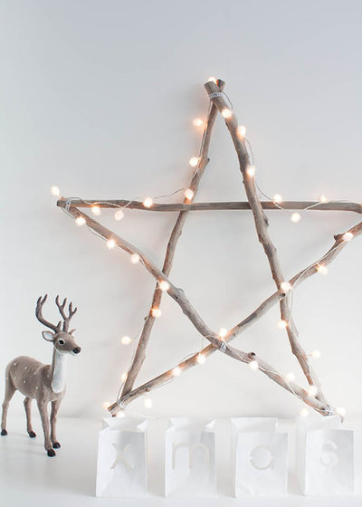 Take your inspiration from the Scandinavian elegant and put a festive accent on natural textures such as bleached wood. This bright star was created by tying together five branches of equal length, then wrap the lights around white fairy form. Simple and pretty.